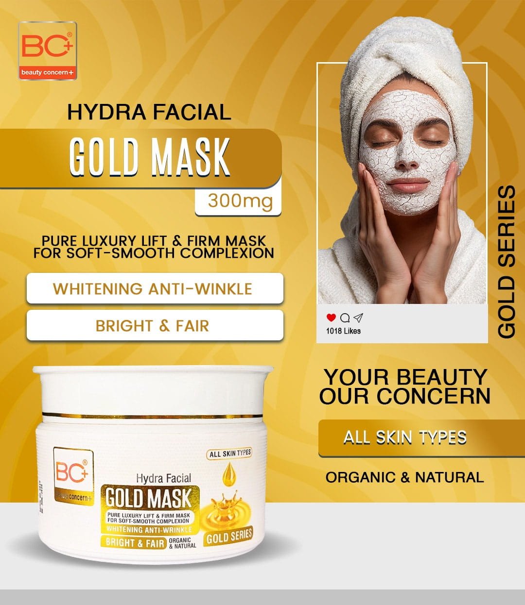 Experience the ultimate in skin rejuvenation with the BC+ Beauty Concern Hydra Facial Gold Mask, a premium treatment designed to hydrate, brighten, and revitalize your complexion. Infused with gold particles and rich, nourishing ingredients, this luxurious mask delivers intense moisture and helps to enhance your skin’s natural radiance. Ideal for all skin types, it provides a spa-like experience that leaves your skin feeling refreshed, smooth, and luminous.